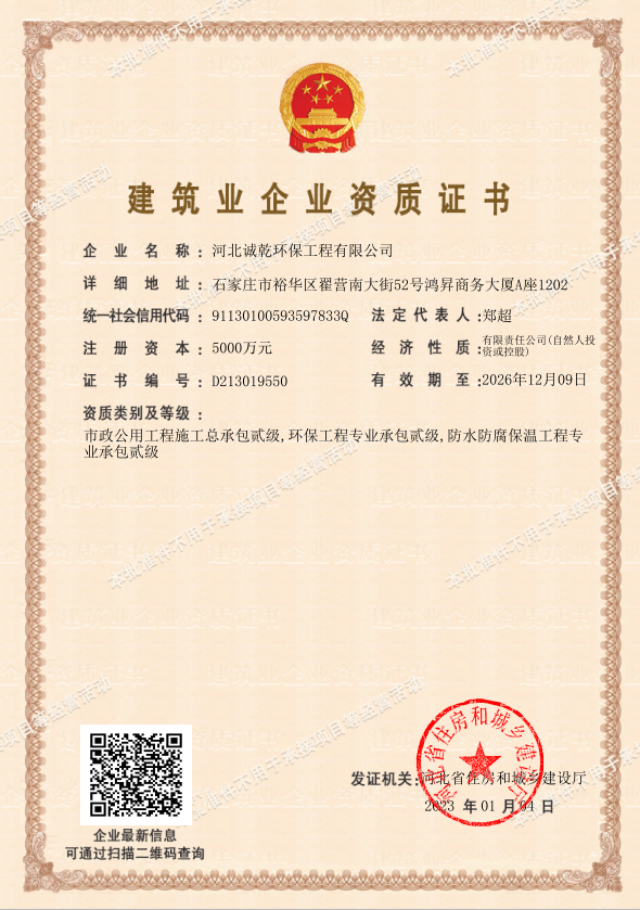 2023年1月4日,河北誠乾環(huán)保工程有限公司取得由河北省住房和城鄉(xiāng)建設廳頒發(fā)的市政公用工程施工總承包貳級資質。